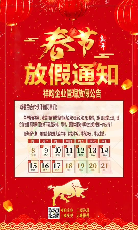 今天是2021年2月8日,公司下午正式开始放假,祥昀企业放假公告如下,请各位合作伙伴和同事做好节前后安排,同时,感谢大家对祥昀企业始终如一的支持!